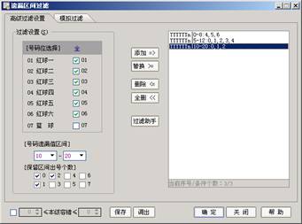 3、设置号码出现个数范围:设置投注结果指定号码位中号码遗漏值满足所设置遗漏值范围的号码个数范围值,如果投注结果不满足该范围,则被滤除(不考虑容错等设置);