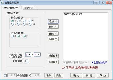 3、设置必选余数个数范围:设置投注结果必须满足的必选余数个数最小、最大范围值,如果投注结果的必选余数个数不满足该范围,则被滤除(不考虑容错等设置)。
