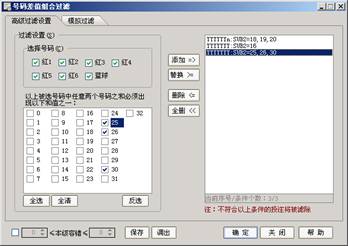 2、设置必须出现的差值:设置投注结果所选任意两个号码之和必须出现的差值范围值,如果投注结果未出现所选差值,则被滤除(不考虑容错等设置)。
