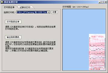 如果您的计算机安装了我公司的《赢彩投注站专用高速打票系统》,则可直接将投注结果输出到该系统中,使用更方便,打票更快捷。