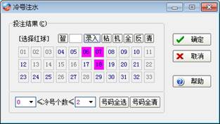 用户根据以往的统计分析数据判断这些冷号可能出现的个数为0-2个,则可如下设置投注条件: