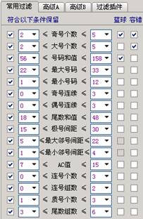 ③ 过滤保留范围最大值。即投注结果必须满足的最大范围,如果投注结果大于该值,则被滤除。例如,有一投注结果为 01 02 03 04 05 06 + 11,其号码和(不包含蓝球)为21,如果设置号码和过滤的最大值为40,则该投注结果被保留(不考虑其他过滤条件)。