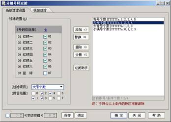 2、设置过滤类型:选择您要使用的过滤选项类型,现提供的有奇号个数、大号个数、质号个数过滤等。