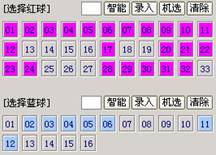 A、直接使用鼠标点击需要的号码:用鼠标左键点击需要的红蓝球号码,该号码改变为相应的红或蓝色,表示该号码已经被选中;用户再次点击该号码,则颜色变灰,表示该号码被取消选中。