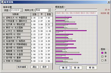 欧洲的博彩公司在每期足彩都根据参赛双方的实力、主客场因素、伤病情况等开出一定的赔率,一般说来他们要比国内的一些推荐更为权威因为他们可能得到一些更为权威的消息,所以说参考他们的赔率进行投注是非常可行的一种投注方式。在使用这种功能时首先要有博彩公司开出的赔率,将其录入到表格中,这时,表格的右侧会根据录入的赔率资料,将录入赔率数据化,自动列出一个复式投注,最后由彩民自主选择取舍。使用赔率回填时首先要知道博彩公司所开出的赔率,将14场比赛的赔率输入到我们所提供的表格中,在每场比赛的表格右侧会出现3个长度不等的柱状图形,它们反映了3、1、0之间的比率情况。在此基础上彩民可以选择概率,概率的最初值为100%,即按照博彩公司认为的该场比赛最可能出现的比赛结果所进行的投注,这样的投注当然只有一注,彩民可以将概率调低,随着概率的降低,有的场次中,代表3、1、0的条状柱与“概率线”相交,这时我们的软件就会把这场比赛选择两个结果。不断地调整概率就会有不同的复式回填到我们的投注中来。这样就可以在我们的投注单中增加根据欧洲赔率所填写的投注结果。