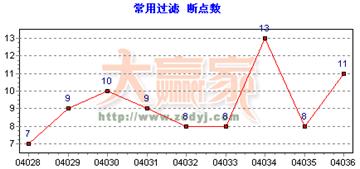 断点数在过滤一些连胜、连平、连负的场次分配很不合理的垃圾注时特别管用。例如出现33333300001111这样的注时,由于其只有3个断点,与通常情况有一定的差异(即特殊了),而且胜平负的比例与分配又十分不合理,这时用断点数过滤,比如断点数的范围圈定为5~12之间,那么就可以把这样特别的中奖几率相当小的投注给过滤掉,避免自己资金的浪费。