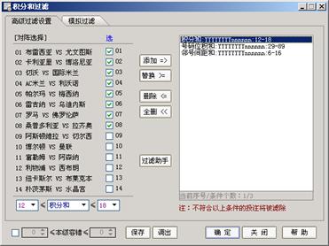 分组过滤是对针对某些场次进行过滤。这种过滤方法可以更好地发挥彩民对这些场次的理解。在实际过程中,彩民不可能对14场比赛的28支队伍都十分了解,但对于某些场次却可以作到这一点,特别是对于那些有多年看球经验的彩民,对于意甲的比赛应该比较熟悉,但法甲则相对陌生一些。分组过滤功能可以避开这些场次,由彩民自己选择比较熟悉的场次进行定义过滤条件并进行过滤。例如彩民可以选择14场比赛中的4场比赛进行定义胜场数、积分和等过滤。按照用户选择的比赛场数,设置积分和、胜场数、平场数、负场数对投注结果进行过滤,例如:1~4四场比赛用户认为平场数:2≤平场数≤3,那么,投注结果中前四场比赛平场数符合2≤平场数≤3范围的将被保留,其余的则被滤除。
