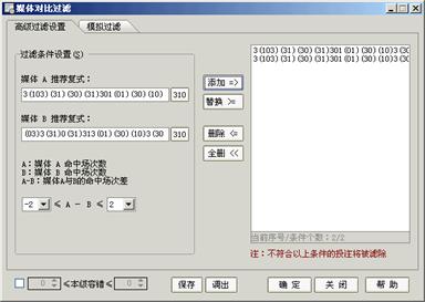 3、设置命中场次差范围:设置投注结果对于两个媒体推荐投注的命中场次差的最小、最大范围值,如果投注结果不满足该范围,则被滤除(不考虑容错等设置)。